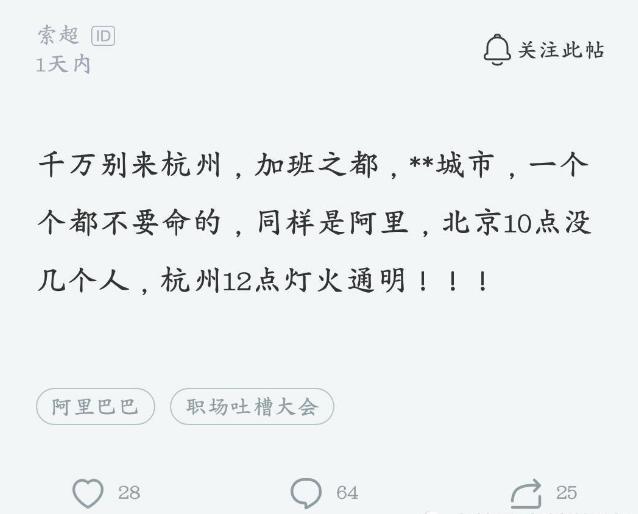 阿里员工:北京晚上10点没几个人加班,杭州12点灯火通明
