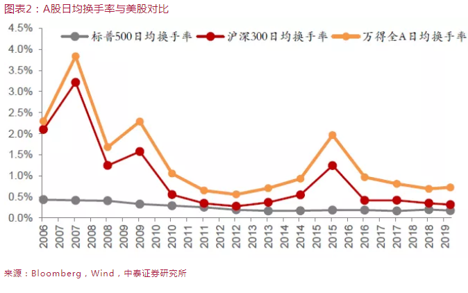 例如,2015年万得全A月收益率波动高达13%,以沪深300为代表的大盘股波动率也有10%,与此同时,标普500波动率仅为4%。2006年至今标普500的日均换手率长期保持在0.5%以内,而万得全A日换手率最高将近4%,是标普500的8倍。
