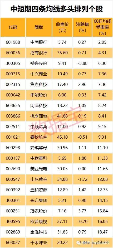 一般来说,均线多头排列代表买方力量强大,后市由多方主导行情概率较大。截至6月17日,27只个股5日、10日、20日、60日四条均线近日呈多头排列。其中中国银行、招商银行、裕兴股份股价与60日均线的乖离率最小,分别为2.05%、4.31%、6.30%。