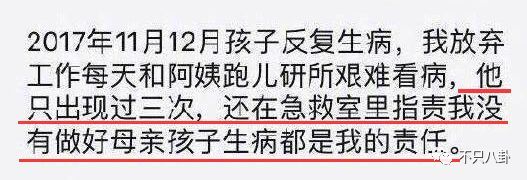 2017年底,刁磊孩子反复生病,刁磊却只出现在医院三次,还指责前妻没有照顾好孩子,孩子生病都是她的责任。