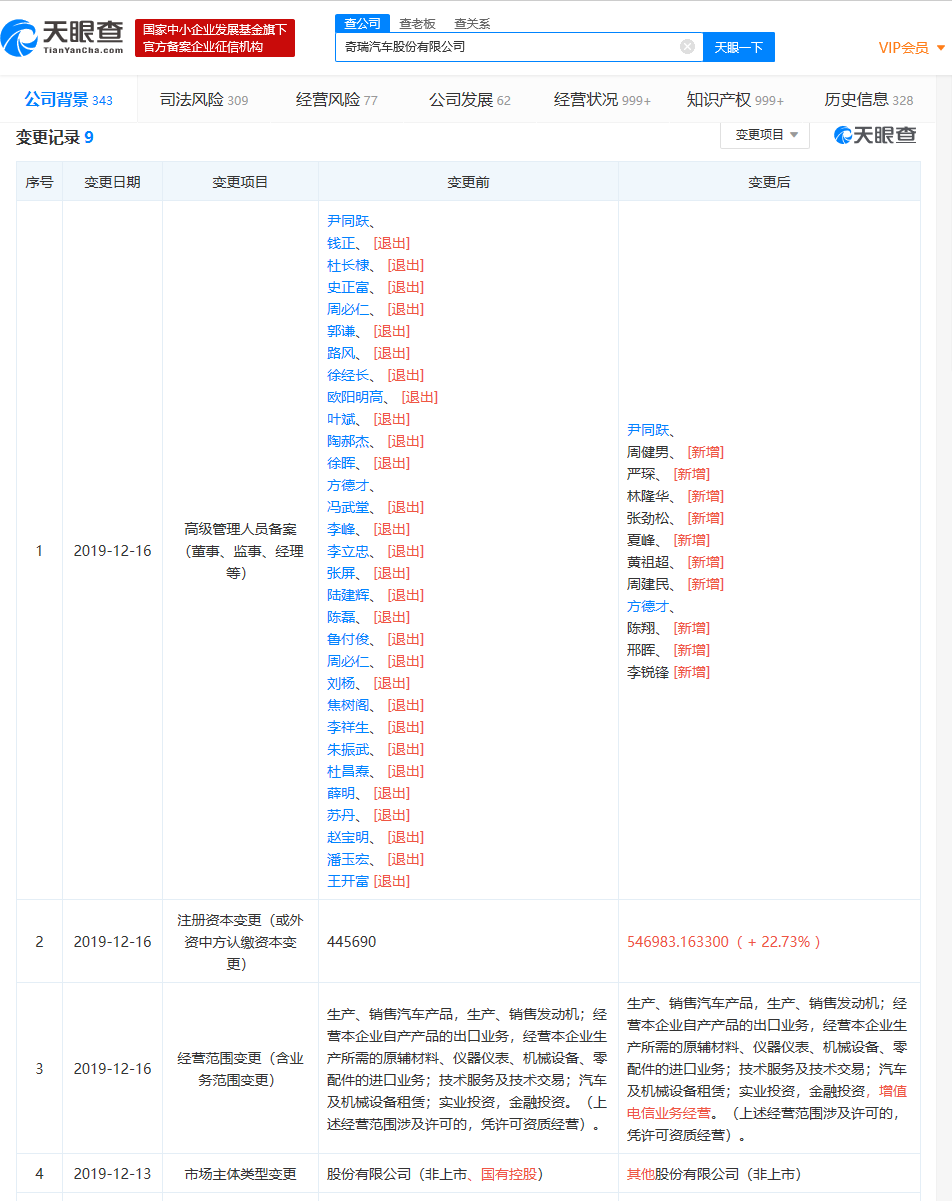 12月18日,据天眼查数据显示,2019年12月16日,奇瑞汽车的运营主体奇瑞汽车股份有限公司发生一系列变更。其中,29位高管集体退出,同时新增高管10位。