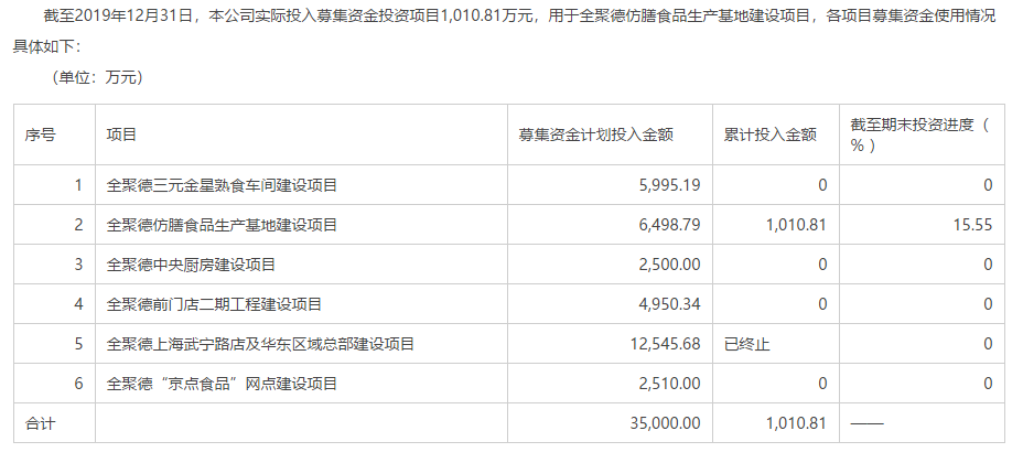 但是最近全聚德披露的公告显示,截至2019年12月31日,全聚德实际投入募集资金投资项目仅1千万元,用于全聚德仿膳食品生产基地建设项目,其余5项募投项目累计投入金额与投资进度均为0。