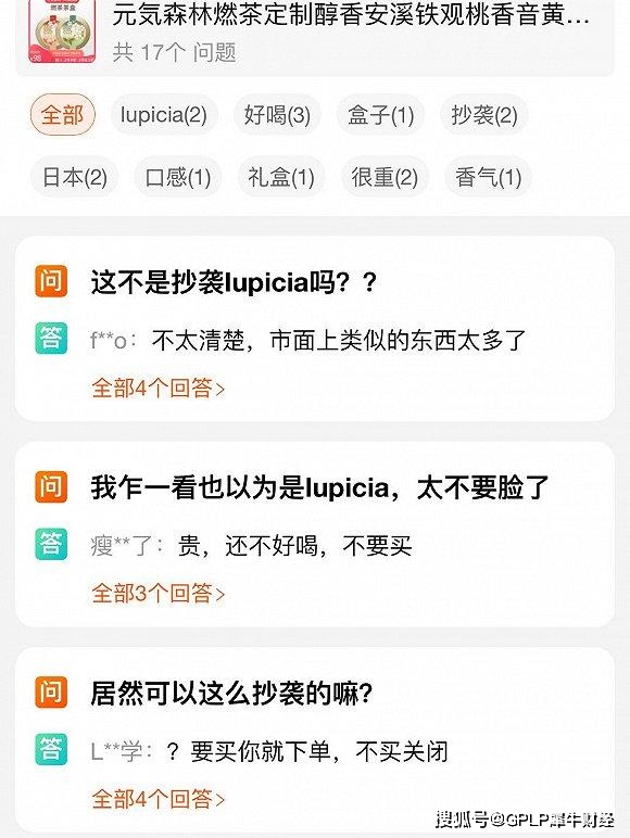 近日,有消费者发现,元气森林在其天猫旗舰店售卖的一款茶叶礼盒“燃茶”,外包装和产品设计与日本著名茶叶品牌LUPICIA有相似之处。