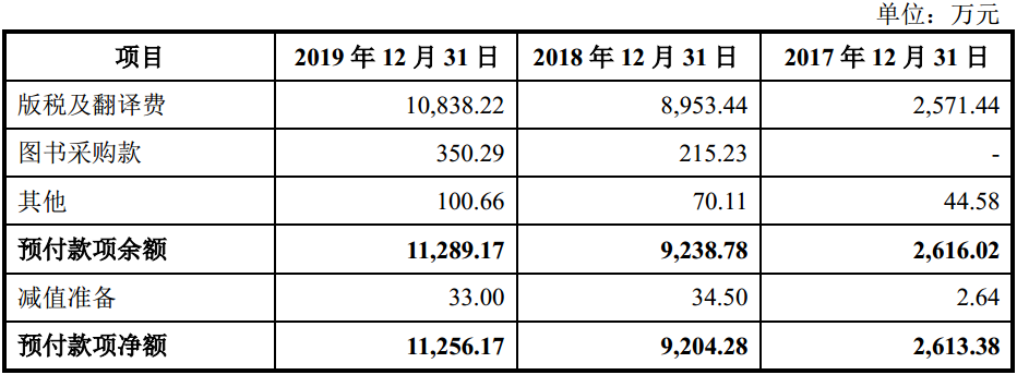 2017年末至2019年末,果麦文化的预付款项净额均绝大部分由版税及翻译费构成。截至2019年末,其对杨红樱、蔡崇达、张皓宸的预付款项余额分别为1360.47万元、876.7万元、537.1万元,均属于预付款项余额前五名。
