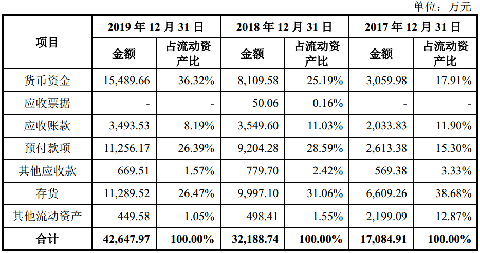 截至2019年末,其预付款项、存货、应收账款净额合计为2.6亿元,占流动资产的比重为61.1%,占总资产的比重为58.3%。
