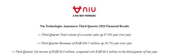 原标题:小牛电动晒第三季成绩单:营收增36.7% 毛利率下降1.3个百分点