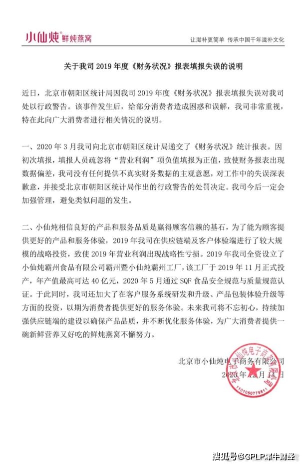 对此,小仙炖在其官方微博回应称,此次失误是因初次填报,填报人员疏忽将“营业利润”项负值填报为正值,致使财务报表出现数据偏差。同时,小仙炖还表示,其公司没有任何提供不真实财务数据的主观意愿,对工作中的失误深表歉意。