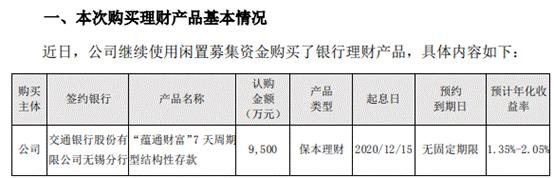 据悉,此前卓胜微已认购交通银行5000万元产品,到期日为2020年12月29日。此外,卓胜微还累计认购了江苏银行股份有限公司无锡科技支行3亿元产品。