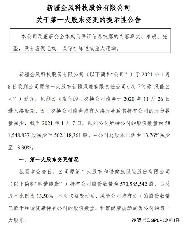 1月11日,金风科技(002202.SZ/02208.HK)发布公告表示,原第一大股东新疆风能有限责任公司(下称“风能公司”),因可交换债券持有人换股导致其持有金风科技股份数量减少降至第二大股东,原第二大股东和谐健康保险股份有限公司(下称“和谐健康”)被动成为第一大股东。