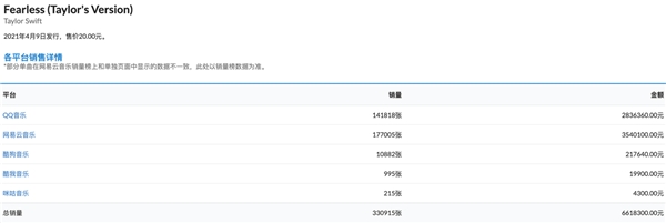以今年Taylor Swift全新专辑《Fearless (Taylor's Version)》销售为例。作为全网销售的数字专辑,这张专辑在网易云音乐上成绩亮眼,截至5月26日销量超17万张,位居全网第一,超过中国其他平台销量总和,证明了平台用户的高付费意识和消费能力。