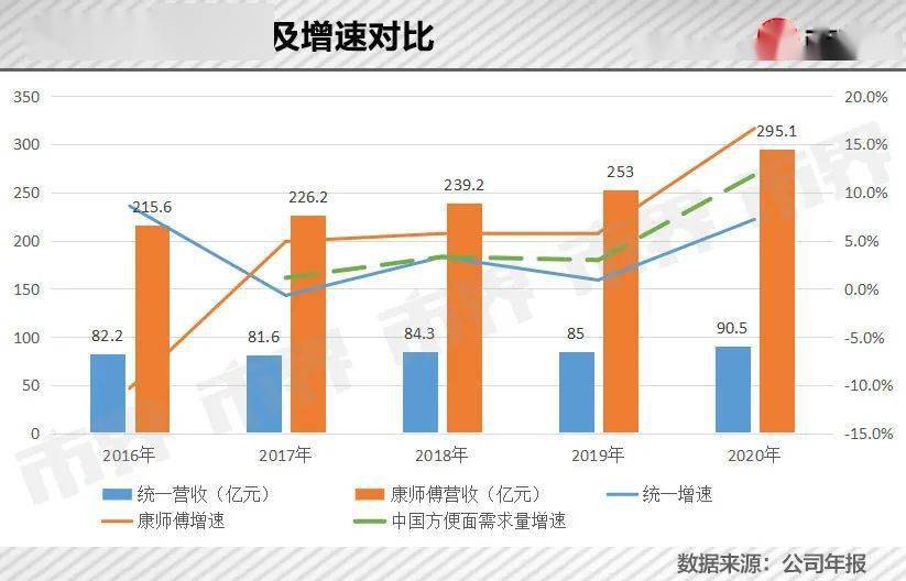 2020年,受疫情影响,方便面再度“回春”,“双雄”的业绩也有所回升。这一年,统一和康师傅方便面业务分别增长了7.2和16.6个百分点,创下了2013年以来的最高增速。