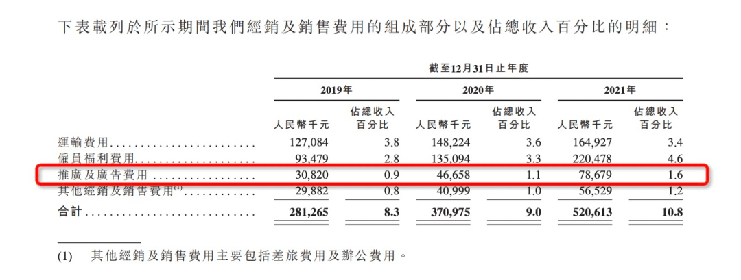 与此同时,加大营销力度,做高销量,扩大整体生意盘子,是消费行业的惯常策略。2021年卫龙推广及广告费用增长68%,达到0.787亿元。占收入比重也从1.1%,来到了1.6%,远高于同期研发费用。本质上,食品行业仍更趋于“营销驱动”。