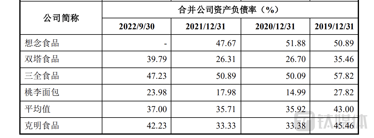 与同行业对比来看,2019年-2022年前三季度,同行业可比公司资产负债率平均值分别为43.00%、35.92%、 35.71%、37.00%,各期末的资产负债率与同行业可比公司平均值基本相当。