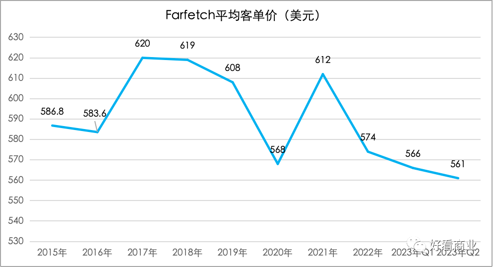 不仅活跃用户数增速放缓,用户在Farfetch花钱也越来越少。Farfetch的平均客单价从2021年的612元一路下滑,到今年Q2时已降至历史低点——561美元,较2021年降超8%。