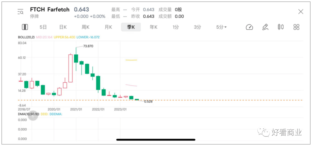 短短3年,Farfetch的命运急转直下,股价较最高点跌掉了99%,260亿美元市值灰飞烟灭,几近归零。