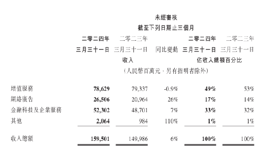 按照具体业务分类:第一季度,网络广告业务收入同比增长26%至人民币265亿元;金融科技及企业服务业务收入同比增长7%至人民币523亿元;本土市场游戏收入同比下降2%至人民币345亿元,国际市场游戏收入同比增长3%至人民币136亿元;社交网络收入下降2%至人民币305亿元。