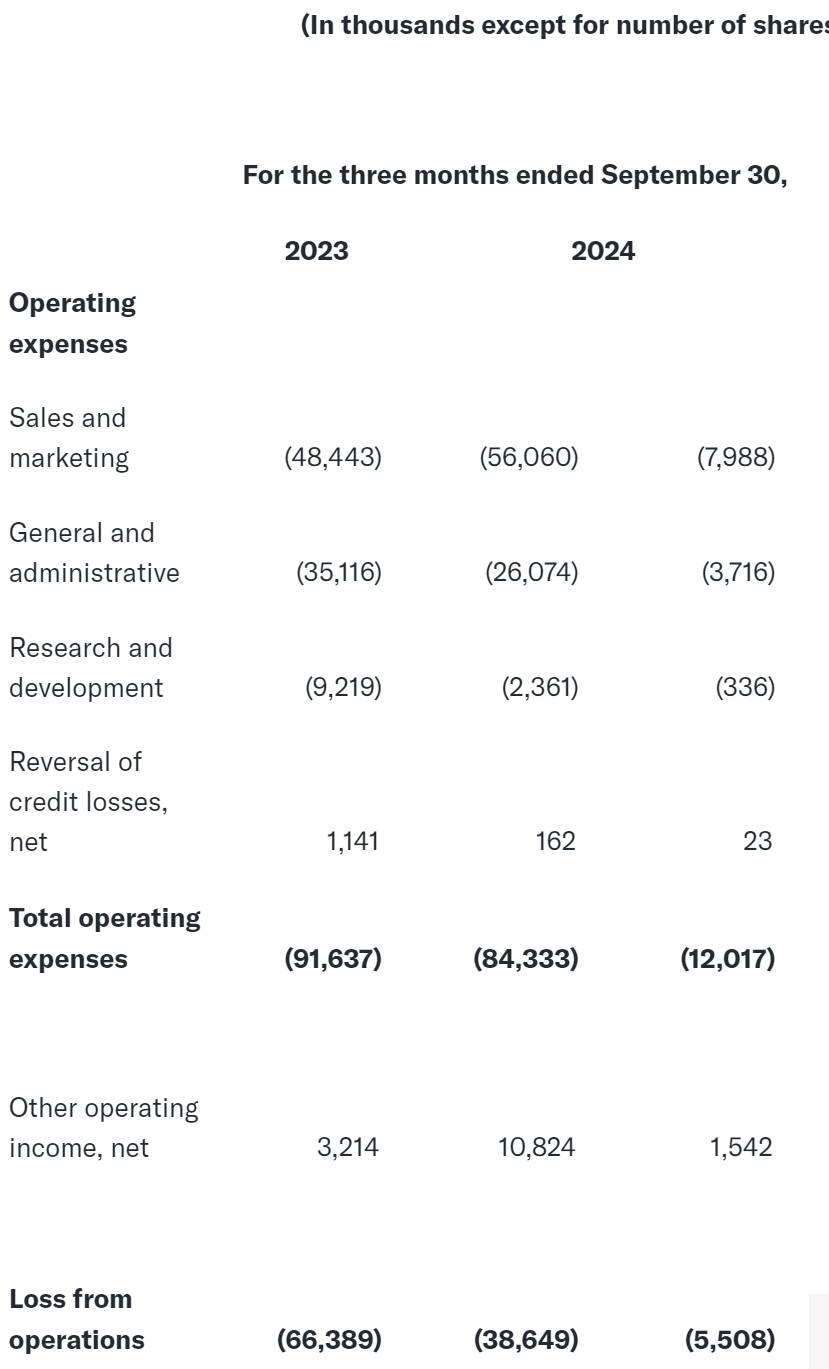 优信2024年第三季度运营亏损为3865万元,净亏损为5917万元。