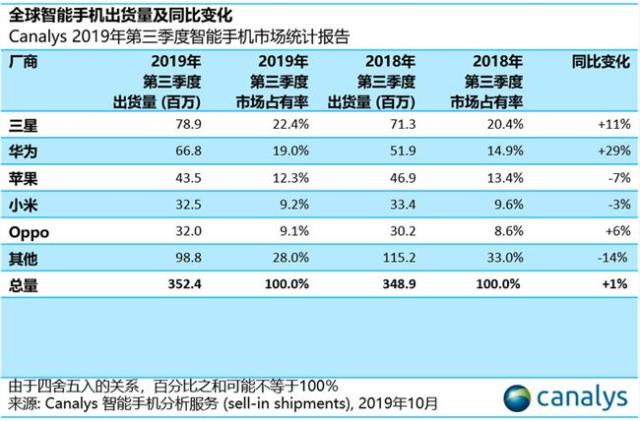 仔细研究这些数据,三星仍然是排名第一的,与2018年第三季度相比,市场份额增加了2个百分点。然而,华为从14.9%的市场份额增长到19%,仅比三星少3.4%。