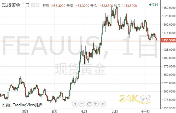 24K99讯 周二(11月26日)亚市早盘,国际现货黄金位于1454.00美元/盎司水平交投。受贸易相关乐观消息影响,市场避险情绪进一步大幅降温,上一交易日金价一路大幅震荡下挫,最终连续第4日收跌于1455.00美元/盎司,本交易日进一步加速下跌,目前延伸跌势至1452.88美元/盎司低点,为11月12日以来最低水平,且跌势还在持续。