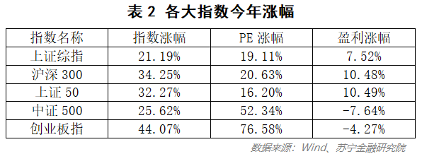 2019年,A股的收益基本来自于估值的抬升(参见表2)。以沪深300、上证50为代表的大盘蓝筹股属于A股的核心资产,整体盈利虽然保持正增长,但增速下降显著,今年以来的涨幅主要依赖于估值的抬升;对于中小盘股,特别是以科技股为代表的创业板指,盈利出现了明显的萎缩,在估值大涨的同时,对指数涨幅产生了拖累。