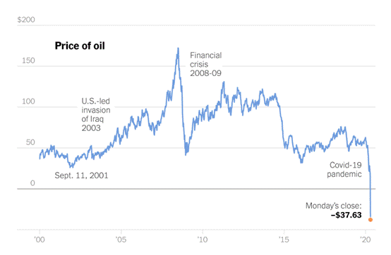 美国原油期货周一崩跌,史上首次跌至负值区域,5月美国原油合约结算价报每桶负37.63美元,跌幅达306%,盘中一度触及每桶负40.32美元的历史低点。