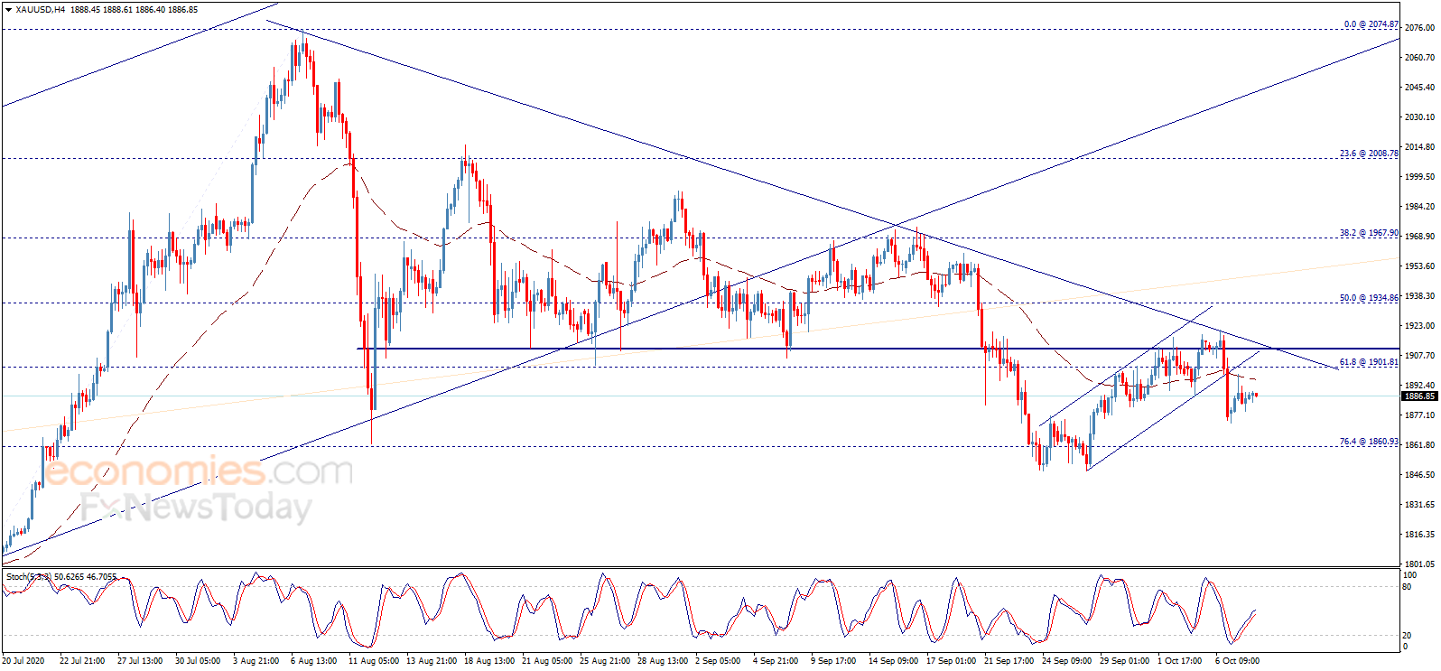 Economies.com在文章中写道,金价自昨日以来显现盘整走势,从4小时图来看,金价目前位于EMA 50指标下方,这一水平对金价形成持续的负面压力,这支持我们在未来一段时间延续看空观点,下一主要目标瞄准1860.80美元/盎司水平。