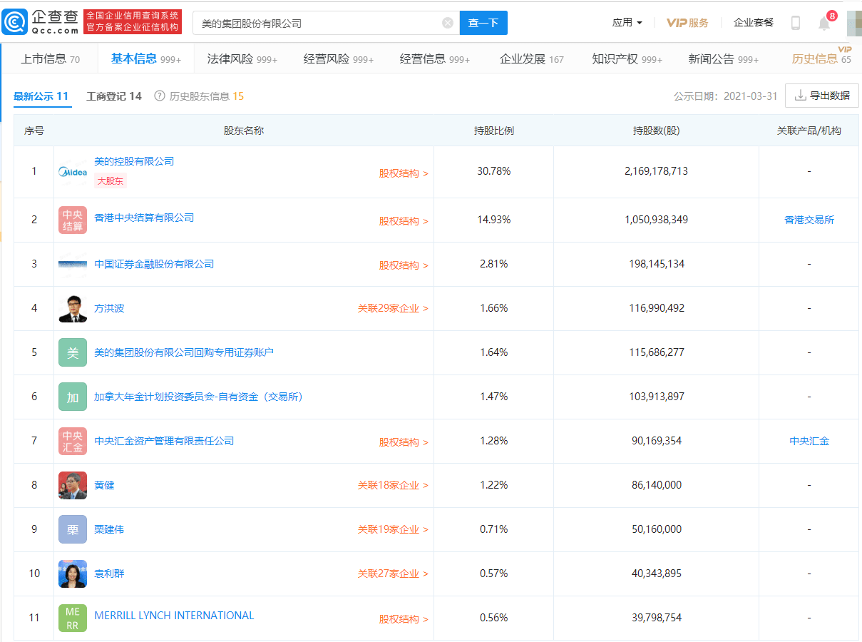 此前,美的发布 2021 年第一季度报告及 2020 年年度报告显示,美的集团第一季度营收 825.04 亿元,同比增长 42.22%;净利润 64.69 亿元,同比增长 34.45%。2020 年全年,美的集团营收 2857.10 亿元,同比增长 2.27%,实现归母净利润 272.23 亿元,同比增长 12.44%。