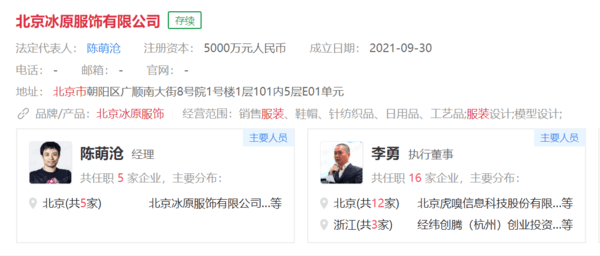 企查查APP显示,今年9月,北京猿力未来科技有限公司(猿力未来)对外投资成立北京冰原服饰有限公司,法定代表人为陈萌沧,猿辅导创始人李勇任该公司执行董事职务,而有媒体披露,陈萌沧是猿辅导创始人李勇在网易新闻期间的前同事,二者关系非同一般。企查查股权穿透显示,猿力未来系猿辅导母公司的一家关联公司,由猿力教育有限公司100%控股。