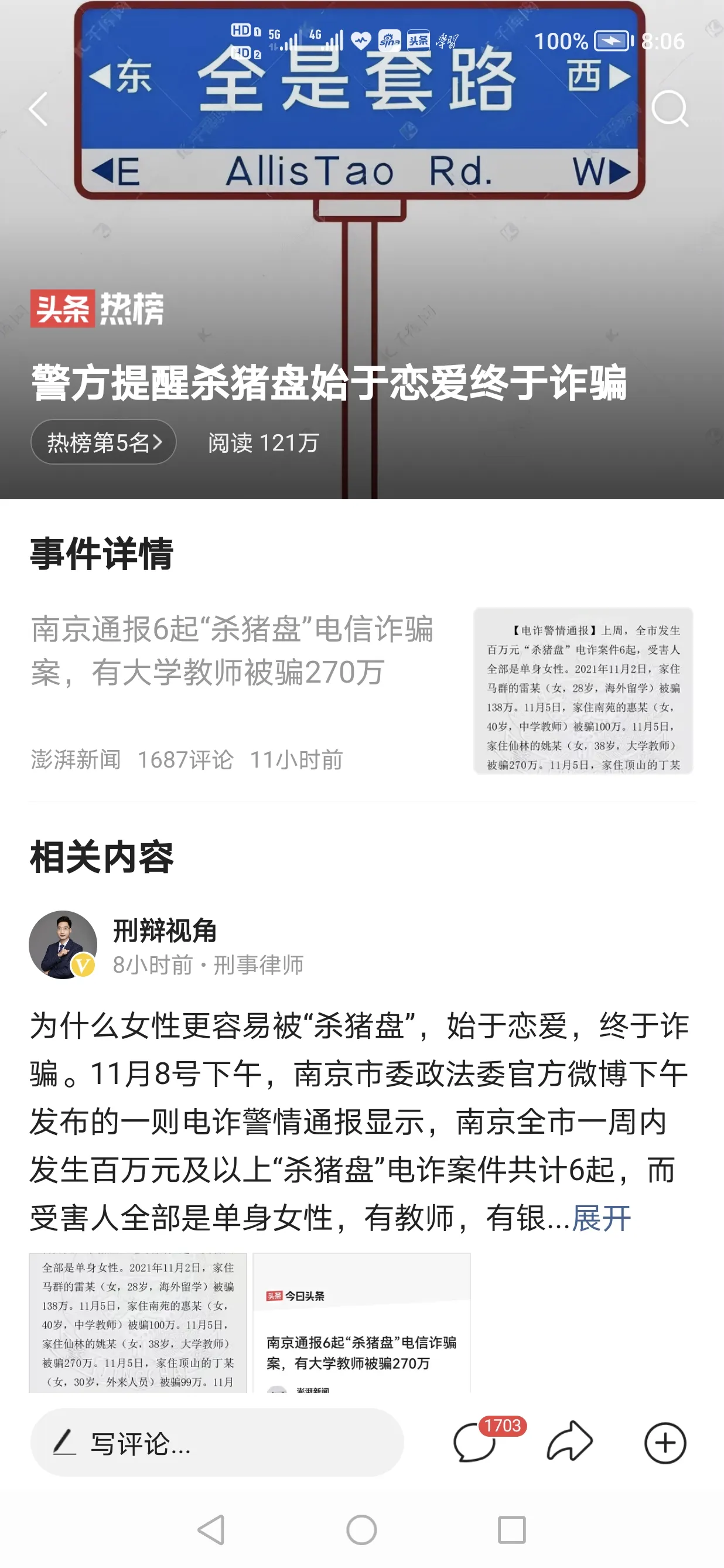 #警方提醒杀猪盘始于恋爱终于诈骗# 【大学教师,银行职工,按理,都是更熟悉杀猪盘行为的,为何反而容易受骗呢】南京市委政法委官方微博11月8日下午发布的一则电诈警情通报显示,上周,南京全市发生百万元及以上“杀猪盘”电诈案件6起,受害人全部是单身女性,其中一名大学教师被骗270万元。