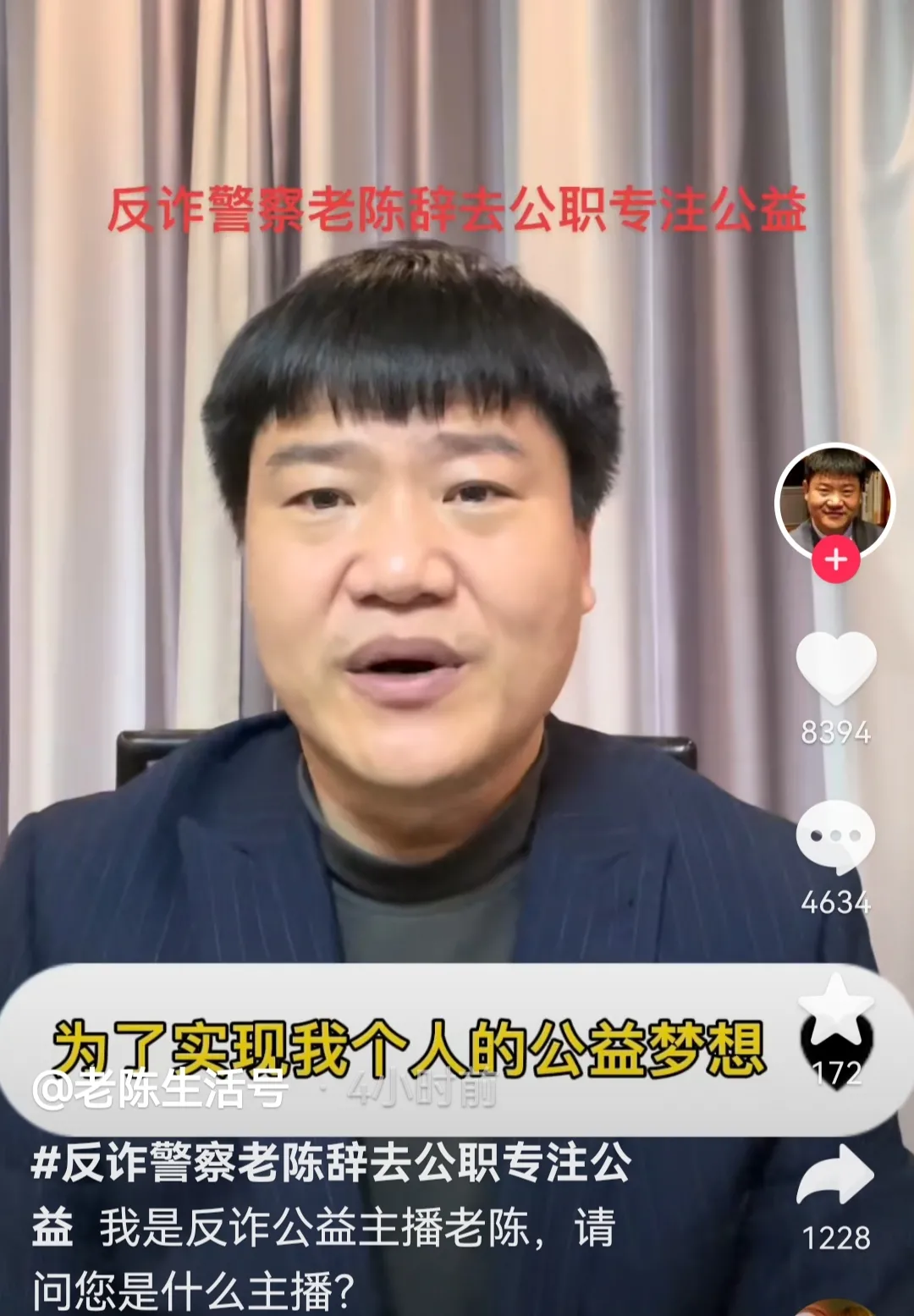 反诈警官老陈宣布离职了,不再是一名警察,以普通人的身份继续在公益路上前行。