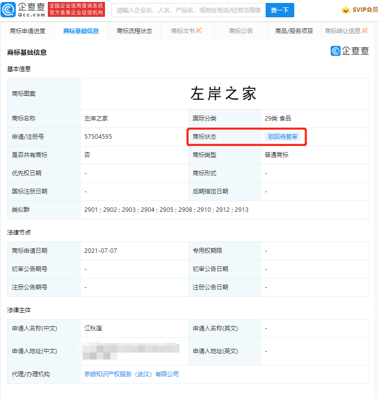 此外,企查查信息显示,江歌妈妈曾申请注册江歌网名“左岸之家”为商标,国际分类涉方便食品、服装鞋帽等,但目前申请的4个相关商标均被驳回。据悉,此前江歌妈妈称考虑做直播赚钱,并获得众多网友支持。