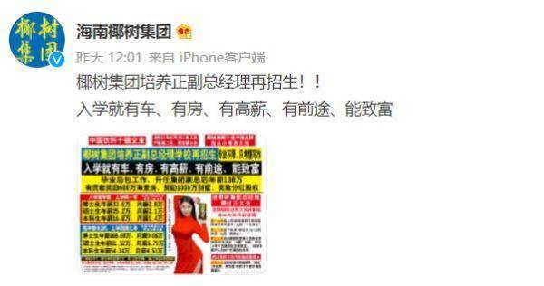 4月12日,椰树集团在其官方微博上发布招聘广告,该广告文案称“入学就有车、有房、有高薪、有前途、能致富。”去年,该相似广告文案“入学就有车、有房、有高薪、肯定有美女帅哥追”去年因违背社会良好风尚内容的广告被海南省市场监督管理局罚款40万元。
