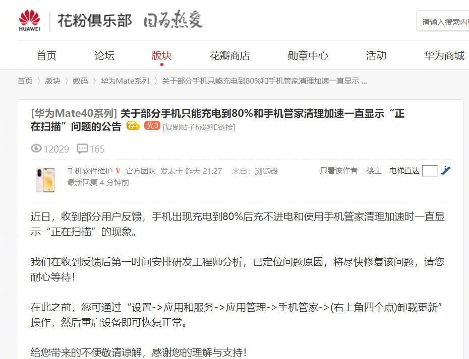 近日,有部分华为用户反馈,手机出现充电到 80% 后充不进电,还有使用手机管家清理加速时,一直显示“正在扫描”的现象。