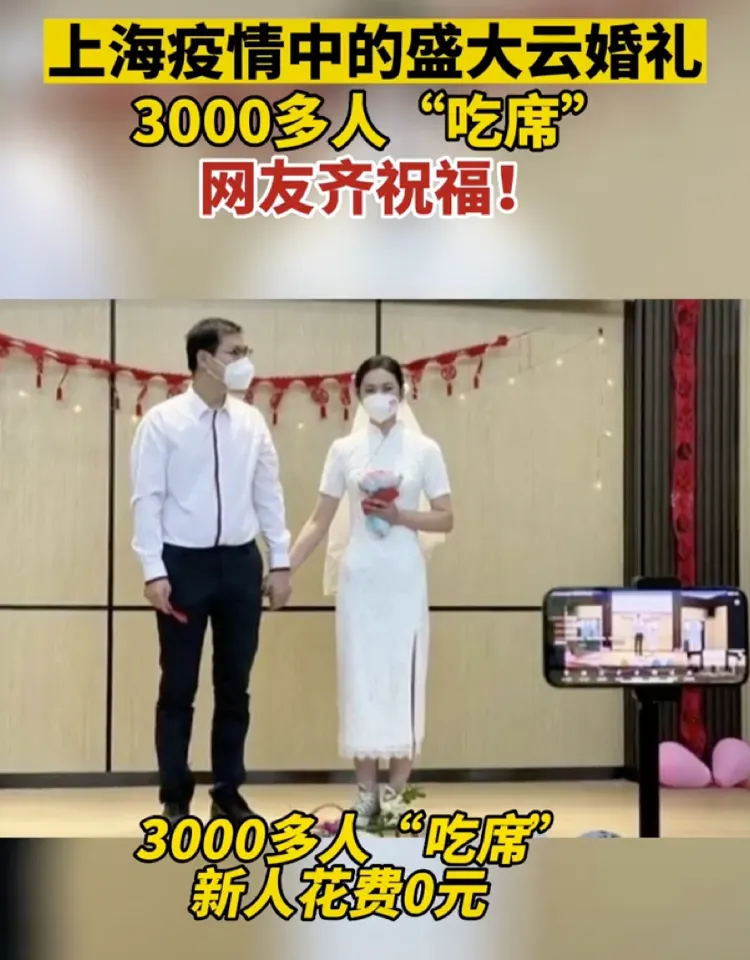 日前,一对新人在上海疫情中举行了盛大云婚礼,有3000多人“吃席”,新人花费0元。收到了众多网友的齐祝福!在特殊的情况下,这个独特的创意,令两位新人终身难忘。