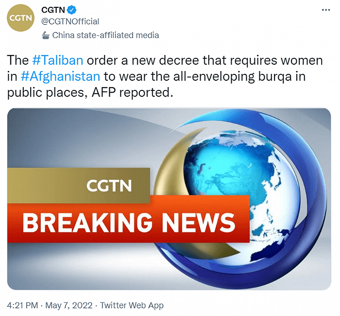本周六, 塔利班当局在喀布尔举行的一次活动中发布了一项由最高领袖海巴图拉·阿洪扎达 (Haibatullah Akhundzada)发布的法令: “她们应该穿chadori(从头到脚的罩袍),因为它代表传统与尊重。”