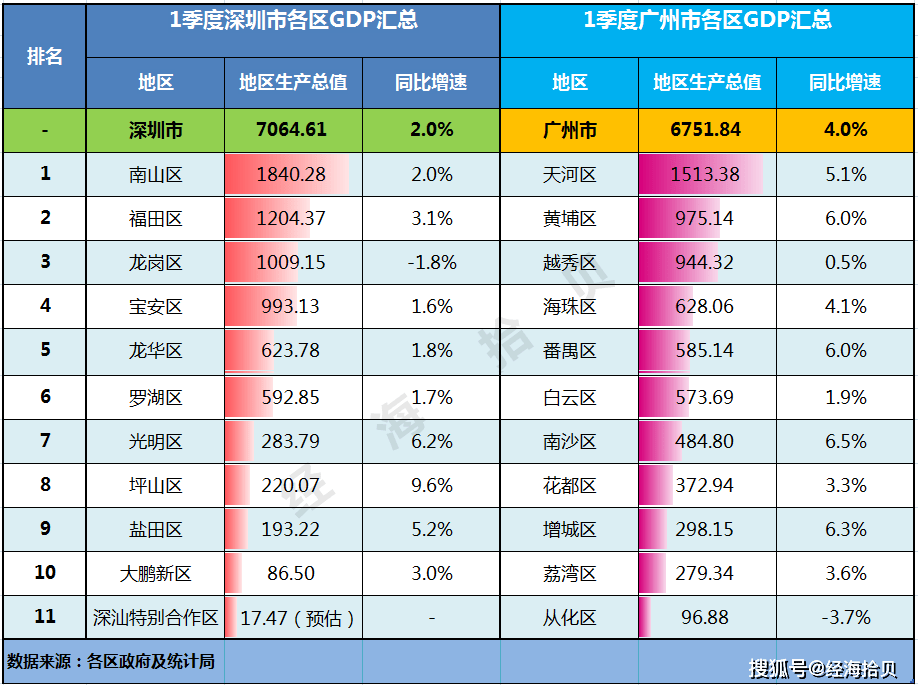 在两市的GDP增速方面,深圳仅有3个区达到全国4.8%的增速,分别是:坪山区增速9.6%,在两市最高,光明区6.2%次之、盐田区5.2%第三,而千亿元的龙岗区为负增长,增速为-1.8%,是深圳唯一一个负增长的地区。相比之下,广州有5个区达到全国增速,分别是:南沙区增速6.5%、增城区6.3%、黄埔区6%、番禺区6%、天河区5.1%,唯一负增长的地区是总量(96.88亿元)垫底的从化区,增速达到-3.7%!总体来说,一季度广州增速高于深圳。