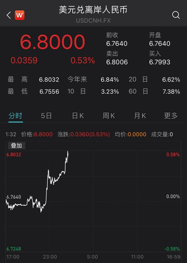 5月12日,离岸人民币对美元汇率跌破6.8,跌幅超0.5%,创2020年10月以来首次。