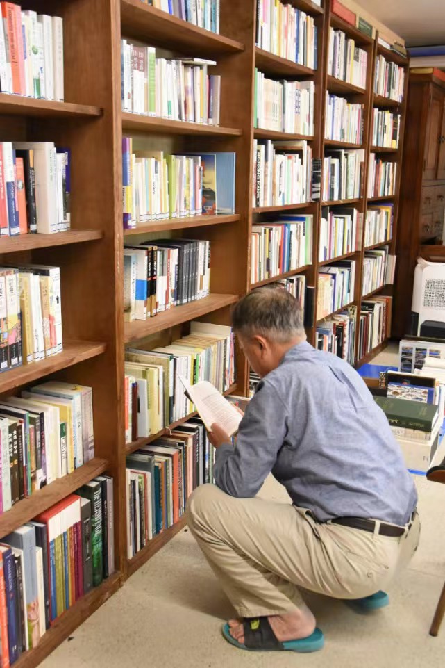 他的住所看起来占地面积颇大,有种着树苗的庭院,还有超大的书房。文在寅脚穿一双拖鞋,时而站在庭院里,用水管浇树,时而蹲在书房的角落翻看自己的藏书,还在安保人员的陪同下,出门到乡间小路上遛狗,整体氛围看起来既平和又安静。