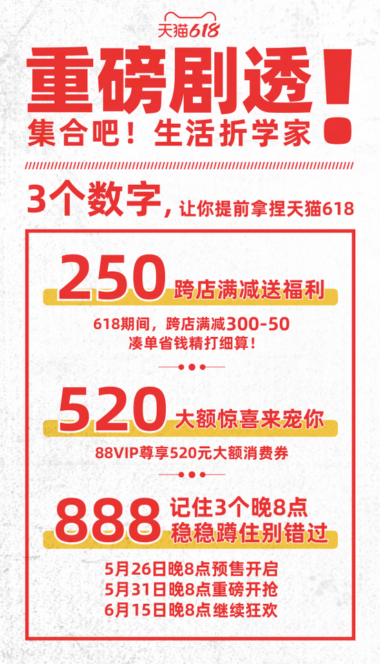 5 月 25 日,天猫发布 618 玩法:预售、抢购均提前至晚 8 点,跨店满减力度提升至每满 300 元减 50 元,“定金立减”玩法取消,改为“参与预售价格直降”。