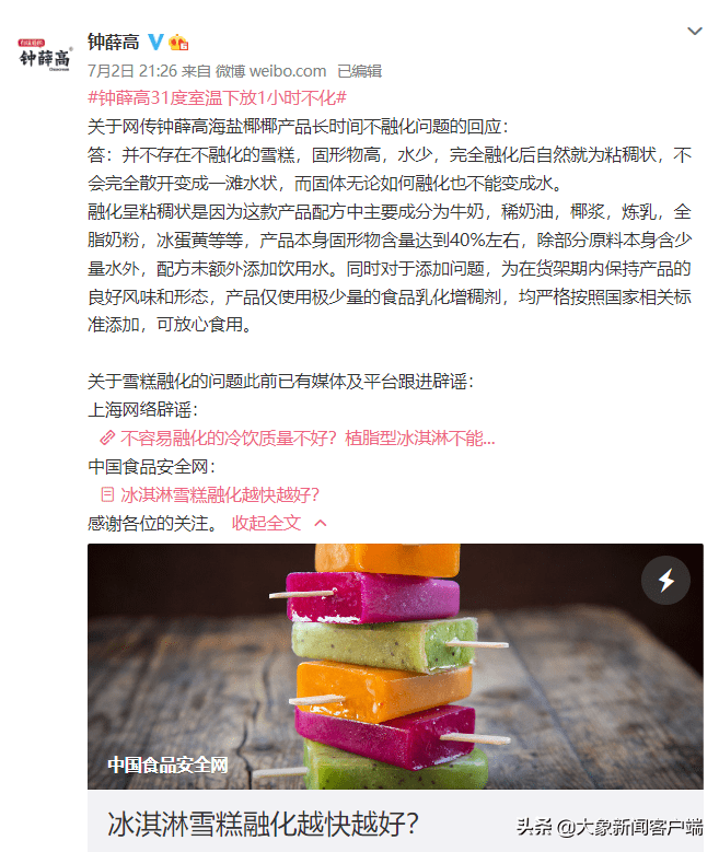 7月2日,钟薛高在网络社交平台回应称,并不存在不融化的雪糕,固形物高,水少,完全融化后自然就为黏稠状,不会完全散开变成一摊水状。同时,钟薛高也承认添加了食品增稠剂,但均严格按照国家相关标准添加。