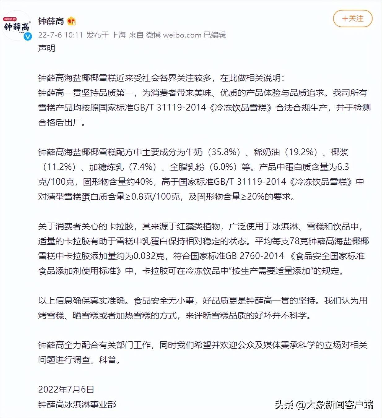 近日,钟薛高雪糕在高温下不会融化一事,引发了大量网友的争议,不少网友对该雪糕的成分产生了质疑。7月6日,钟薛高针对海盐椰椰雪糕中的配比进行了公开回应,平均每支78克钟薛高海盐椰椰雪糕中卡拉胶添加量约为0.032克,卡拉胶广泛使用于冰淇淋、雪糕和饮品中,适量的卡拉胶有助于雪糕中乳蛋白保持相对稳定的状态。