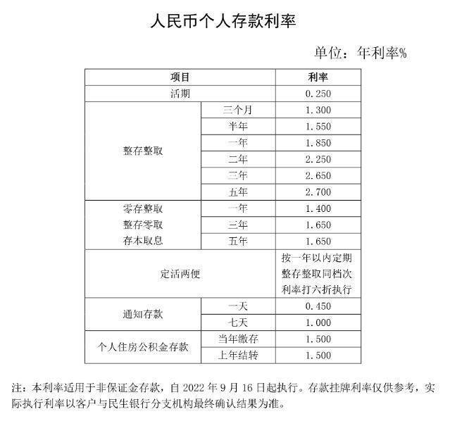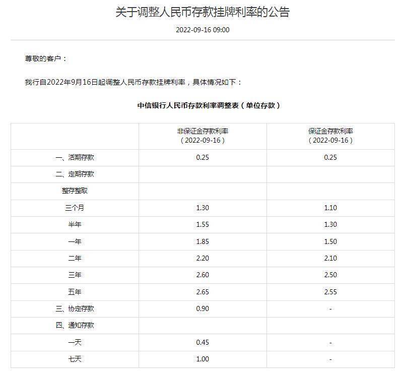 中信银行、民生银行、光大银行9月16日发布公告,调整人民币存款挂牌利率,其中活期存款年利率调整为0.25%,定期整存整取三个月年利率为1.3%,半年1.55%,一年1.85%。