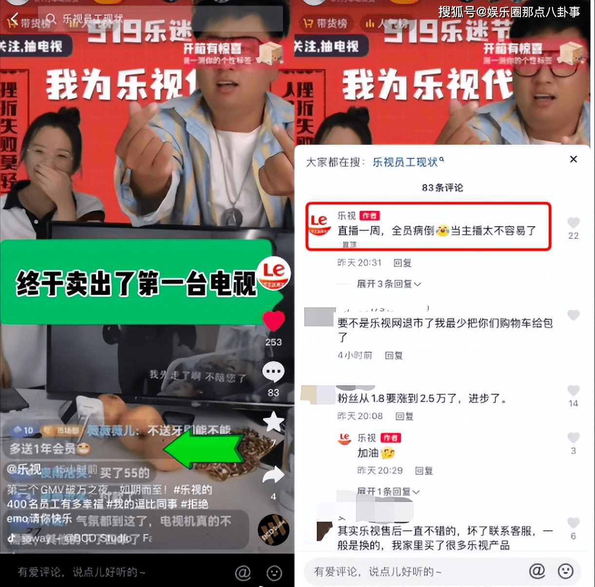 在宣布单场GMV破万后,乐视又发布视频宣布卖出了第一台电视,不过在该视频下面,乐视官方留言称:直播一周,全员病倒,当主播太不容易了。