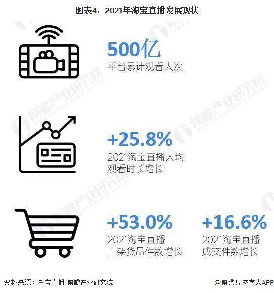 目前,淘宝直播是我国消费类直播第一平台,截至 2022 年 3 月,累计观看人次已经超过 500 亿 ;2021 年人均观看时长同比增长 25.8%,这也见证了直播电商越发 " 常态化 " 地融入消费者的生活。