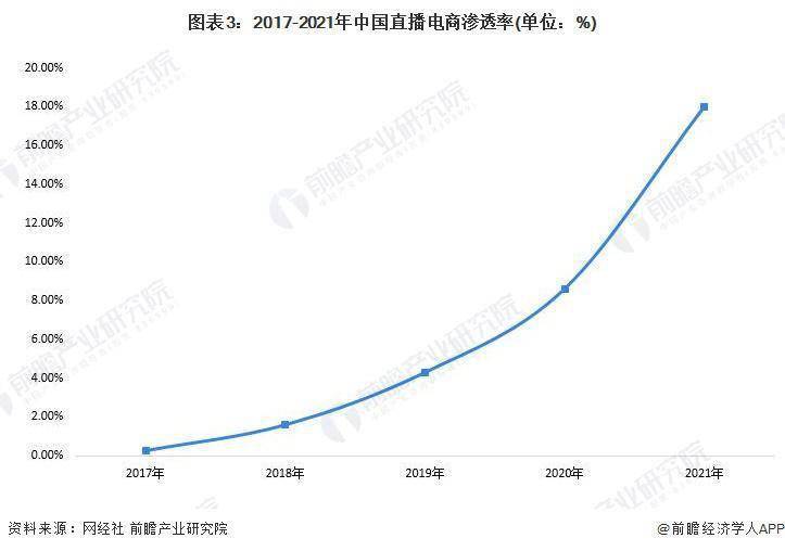 2017-2021 年,我国直播电商渗透率 ( 直播电商渗透率 = 直播电商交易规模 / 网络零售交易规模 ) 从 0.27% 增长至 17.97%。