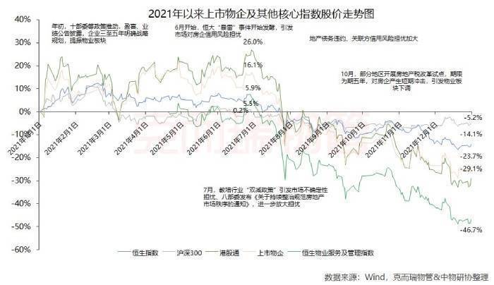 克而瑞研究报告指出,2021年下半年,(来自地产行业的)不确定性担忧情绪延展到物业管理行业,资本市场降温,市场对上市物企的高估值逐渐回调,下半年股价下滑明显。截止2021年末,上市物企股价下跌23.69%,其中港股通物企股价下跌29.09%,恒生物业服务和管理指数下跌46.74%,跌幅高于恒生指数和沪深300(分别下跌14.08%和5.20%),物业股板块的整体表现劣于大盘指数。