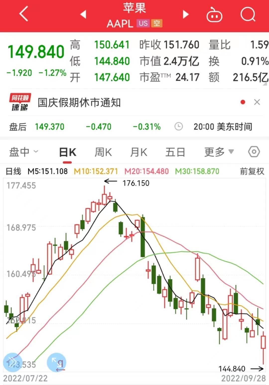 9月28日美股开盘,因市场需求疲弱导致iPhone生产放缓,苹果公司股价一度大跌4.1%。当日收盘,苹果股价跌1.27%,报149.84美元。自8月17日以来,苹果市值已蒸发了3970亿美元。