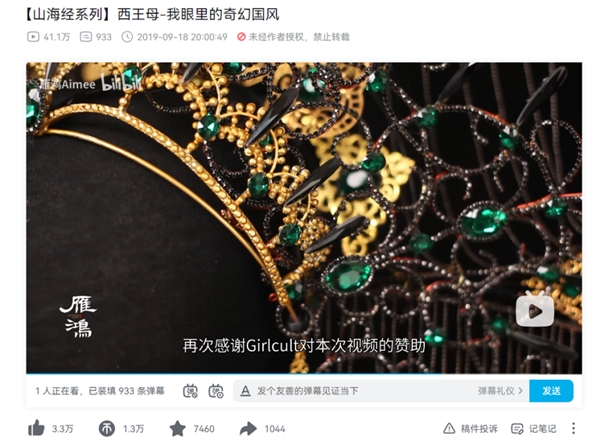 UP主雁鸿Aimee用易拉罐做成冰雪铠甲、把吃剩下的坚果壳做成黄金甲……神奇脑洞和灵巧双手使得雁鸿Aimee在B站深受欢迎。2019年9月,雁鸿Aimee更新视频《西王母——我眼里的奇幻国风》,这是她《山海经》系列的首个国风手工艺视频,之后,她在原创上一发不可收拾。