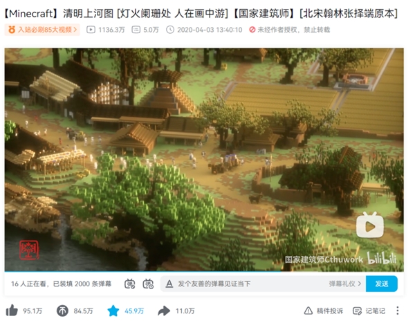 UP主“国家建筑师Cthuwork”主打Minecraft建模,其作品《清明上河图 [灯火阑珊处 人在画中游]【国家建筑师】[北宋翰林张择端原本]》一举封神,入选入站必刷85大视频。