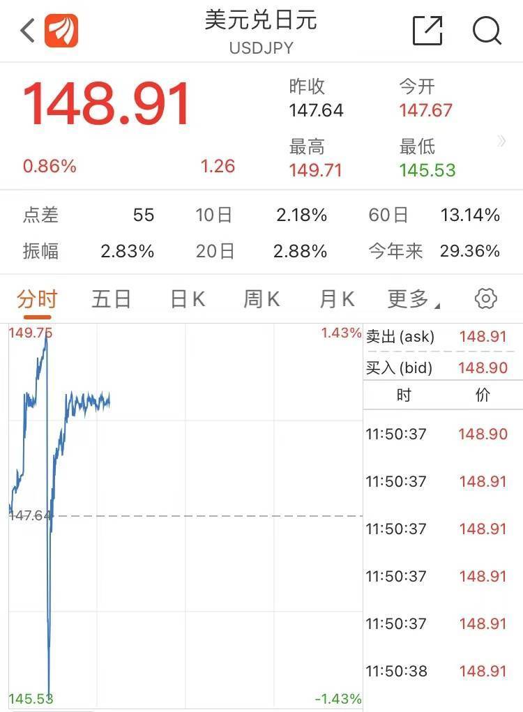 截至发稿,美元兑日元报148.91,日内振幅达2.83%。